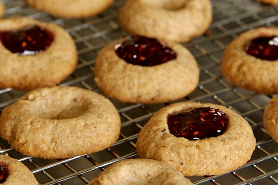 5. Roll into walnut-size balls and place on the parchment oiled baking sheet. Flatten with the palm of your hand then press in the center with your thumb, making a nice imprint for the jam or chocolate to go. Bake at 350 degrees for 15 minutes, checking at 10 minutes. Nut flour can burn easily.